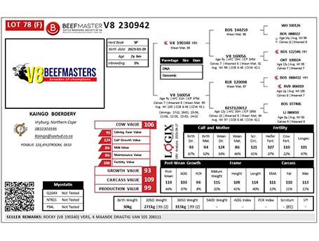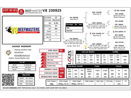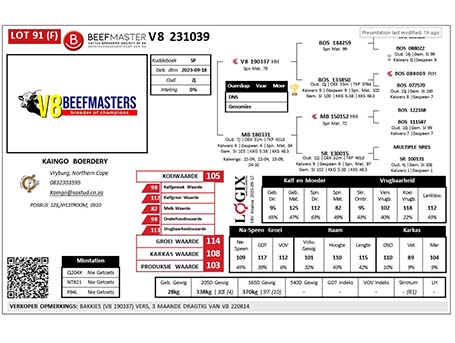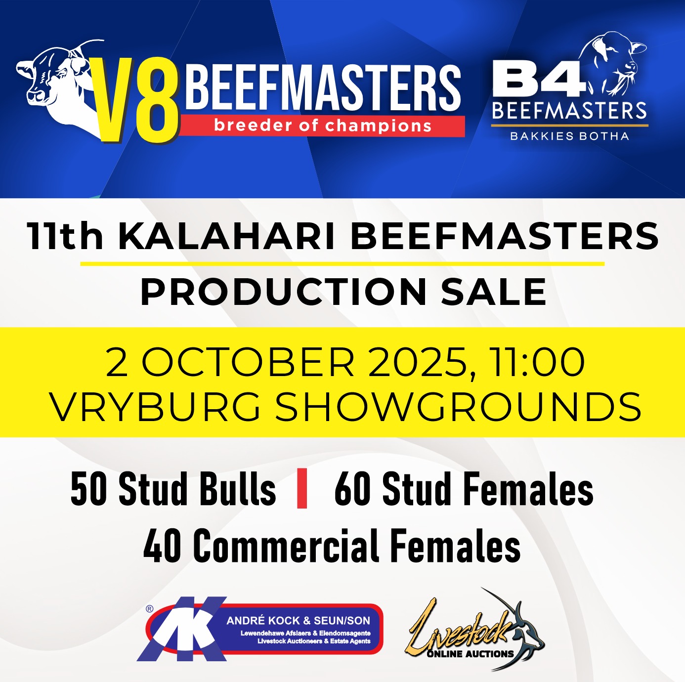 | Description :Welcome to the Kalahari Beefmasters Auction! Should you require any assistance with online bidding or have any questions, please don’t hesitate to contact Natalie at 082 444 9968. | |